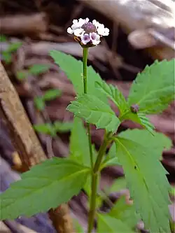 - Drobne, zebrane w gęste kwiatostany główkowate lub kłosokształtne, wzniesione na długich szypułach wyrastających w kątach liści. Kwiaty są siedzące, wsparte jajowatymi przysadkami. Kielich błoniasty, z krótką rurką z dwoma lub czterema ząbkami na szczycie. Płatki korony cztery w dolnej połowie zrośnięte w prostą rurkę, w górnej z rozpostartymi, nierównej wielkości łatkami koloru białego, lawendowego lub fioletowego. Pręciki są cztery, przyrośnięte do górnej połowy rurki korony i w niej schowane, dwusilne, z ogruczolonym łącznikiem[6][7]. Zalążnia górna, dwukomorowa, w każdej komorze z pojedynczymi zalążkami[7]. Szyjka słupka pojedyncza, krótka, ze skośnym znamieniem[6].