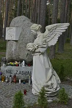 - pomnik zamordowanych dzieci, na który składają się głaz wykopany w lasach piaśnickich oraz rzeźby dłuta Tomasza Sobisza, przedstawiające anioła i pustą kołyskę. Został odsłonięty w 1993 roku[38].