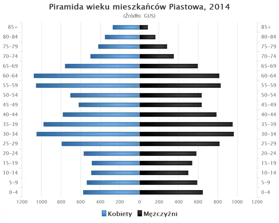 Piramida wieku mieszkańców Piastowa w 2014 roku[11].