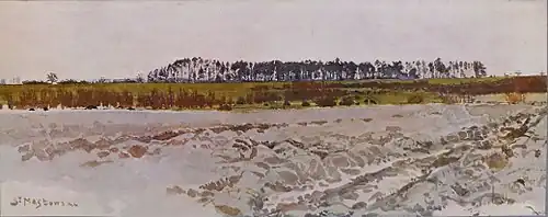 - ↑ Akwarela została namalowana w pobliżu wsi Pieczyska w okolicach Grójca w okresie, kiedy artysta bywał tam często z wizytą u swego kolegi Czesława Tańskiego – zob.: Masłowski M. [oprac.]: Stanisław Masłowski – Materiały do życiorysu i twórczości, Ossolineum, Wrocław 1957, ss. 112-113 (przypisy 25 i 34), a także: Halina Cękalska-Zborowska: Wieś w malarstwie i rysunku naszych artystów, Ludowa Spółdzielnia Wydawnicza, Warszawa 1969, s. 272. Tutaj zamieszczono kopię reprodukcji z albumu „Sztuka Polska – malarstwo w reprodukcjach kolorowych”, H.Altenberg, Lwów [1904] (oryginał wówczas należał do Bohdana Wydżgi). Tamże we wstępie do tej reprodukcji (s. 49) pisał Feliks Jasieński: […] >>patrzę na odbitkę „lasku” Masłowskiego, naszego, po naszemu przetrzebionego lasku, z taką przedziwną finezyą i prawdą, przez wielki indywidualny talent oddanego lasku, który wraz z innymi klejnocikami, krył się długo w skromnym, brudnym, maleńkim notatniku artysty, w jego „Mandze”. Bo się zachwycam mistrzowskiem oddaniem charakteru tej mikroskopijnej, cichej gruszy „co na miedzy siedzi”, za laskiem na lewo<<[…]