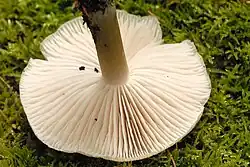 Bardzo szerokie, rzadkie i zatokowato wycięte. Mają kolor od białego do brudnobiałego, czasami są w dolnej części żyłkowane[6]. Mają ząbkowane lub karbowane ostrza i są zaokrąglone przy trzonie[7]. Często między blaszkami przebywają skoczogonki[6].