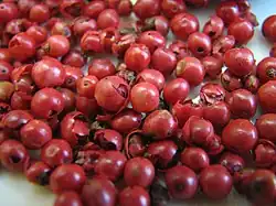 - owoców Schinus terebinthifolius (tzw. "brazylijskiego drzewa pieprzowego") i Schinus molle (tzw. "peruwiańskiego drzewa pieprzowego"), zwanych też ziarnami schinusowymi. Owoce te mają czerwonofioletową, kruchą otoczkę i używane są jako zamiennik pieprzu czarnego, do którego podobne są wielkością i smakiem[3][4],