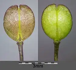 - Odwrotnie jajowata łuszczynka o długości 2.5–3,5 mm i szerokości × 1,5–2.5 (–3) mm. Na szczycie posiada wycięcie o średnicy 0,2–0,4 mm. Nasiona jasnobrunatne, gładkie, jajowate, o rozmiarach 1,1–1,5 × 0,8–0,9 mm z bardzo niewielkim skrzydełkiem[6].
