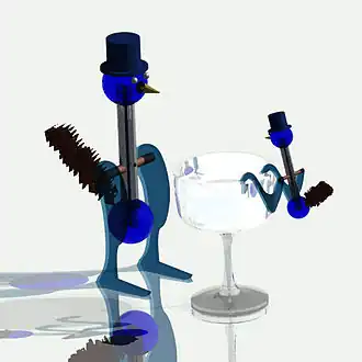 - gdy słup cieczy w szyi dociera do głowy, góra zabawki staje się cięższa i ptak przechyla się, zamaczając filc na głowie w wodzie i uzupełniając w ten sposób odparowaną wodę