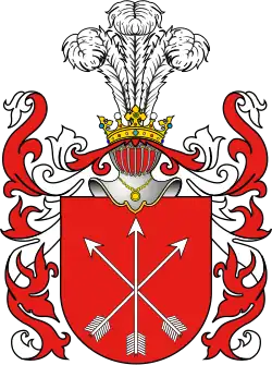 W polu czerwonym na niej dwie strzały w krzyż skośny, srebrne, na nich takaż strzała. Klejnot: trzy pióra strusie.