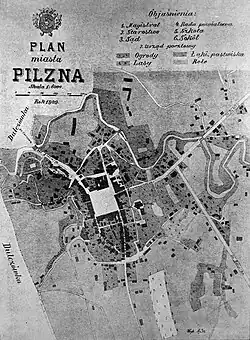 - ↑ Ryszard Kwolek, Karta ewidencyjna obiektu nieruchomego niewpisanego do rejestru zabytku – Układ urbanistyczny historycznego centrum Pilzna [online], zabytek.pl, 4 listopada 2020 [dostęp 2023-03-19] (pol.).