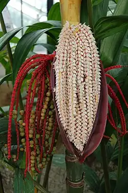 - Jednopłciowe, ale kwiaty obu płci wyrastają na tych samych roślinach (palmy jednopienne) w obrębie tych samych kwiatostanów. Kwiatostany wyrastają zwykle z kłodziny poniżej pióropusza liści, rzadziej między liśćmi. Kwiatostany okryte są w pąku tylko jedną podsadką (spathą), po której opadnięciu zwykle zwisają, rzadziej są wzniesione lub rozpostarte. Rozgałęzienia kwiatostanu są nieliczne, tylko I rzędu lub ich brak. Osie kwiatostanu są gładkie, tylko u kilku gatunków są owłosione. Kwiaty wyrastają na osiach trójkami – z kwiatem żeńskim usytuowanym między parą kwiatów męskich. Zwykle trójki te rozwijają się w dwóch rzędach po obu stronach osi kwiatostanu, rzadziej ułożone są spiralnie w trzech lub sześciu rzędach[8].