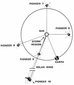 W latach 1965-1968 wysłano cztery próbniki serii Pionier, które oznaczono kolejnymi numerami 6, 7, 8, 9. Powstała w ten sposób sieć czterech obiektów krążących po orbitach zbliżonych do orbity okołosłonecznej Ziemi. Układ ten umożliwił kompleksowe poznanie warunków fizycznych panujących w przestrzeni międzyplanetarnej i równocześnie kontrolę stanu aktywności słonecznej[4]. Powstał pierwszy układ spełniający funkcję służby ostrzegawczej, umożliwiającej przewidywania wzrostów jej aktywności. Choć sieć ta była jeszcze bardzo niedoskonałym prototypem, odgrywała dość dużą rolę przy planowaniu realizacji lotów załogowych, szczególnie amerykańskiej wyprawy Apollo na Księżyc.