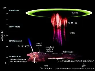 W roku 1994 satelita przeznaczony do obserwacji promieniowania rentgenowskiego i gamma pochodzącego z kosmosu, odkrył silne rozbłyski gamma pochodzące z atmosfery ziemskiej, ponad chmurami burzowymi[9]. Pochodzą one od hamowania elektronów rozpędzonych do energii 20–40 MeV w górnych warstwach atmosfery. Nie jest obecnie jasne, czy są one bezpośrednio związane z jakimś rodzajem wyładowań do jonosfery.