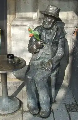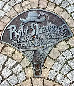 - pomnik Piotra Skrzyneckiego w Krakowie siedzącego przy stoliku pod ścianą, w ogródku kawiarni „Vis-à-vis” w Rynku Głównym w Krakowie