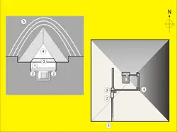 Komora grobowa ma szczególną konstrukcję. Jej dolna część została wykuta w skale podłoża, zaś część górna zabudowana w masywie piramidy. Przed wzniesieniem nadziemnej części piramidy w skale podłoża wykuto szeroki prostokątny szyb. Znajduje się on po zachodniej stronie, przesunięty względem głównej osi piramidy. Został on wyłożony płytami kamiennymi, a następnie wsunięto do wnętrza główną część komory grobowej. Została ona wykuta w jednym ogromnym bloku żółtego kwarcytu w formie skrzyni bez wieka. Ma ona wymiary: 6,7×2,4×1,8 m, a jej waga szacowana jest na około 110 ton. Wyrzeźbiono ją i wypolerowano z niezwykłą precyzją, tak że styki wewnętrznych płaszczyzn - boków, w rzeczywistości stanowiące monolit, sprawiają wrażenie idealnie do siebie dopasowanych osobnych bloków o ścisłych szczelinach. Strop głównej części komory grobowej stanowiły trzy potężne płyty żółtego kwarcytu o grubości 1,2 m i wadze około 40 ton każda. Nie złożono ich jednak bezpośrednio na ścianach głównej komory, lecz na kamiennych blokach położonych na koronie boków komory. Ponad stropem głównej części komory znajdowały się dwie puste przestrzenie, skonstruowane dla zmniejszenia nacisku masy budulca piramidy na główną część komory kryjącą sarkofag władcy. Pierwsza przestrzeń przykryta była płaskim stropem, druga stropem namiotowym, którego dwie części, ważące około 50 ton każda wykonano z bloków wapiennych. Trzecim elementem mającym na celu zmniejszenie nacisku masy budulca piramidy na komorę grobową było sklepienie wykonane z trzech warstw cegły o łącznej grubości 90 cm, okrywające od góry strop namiotowy.