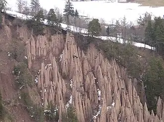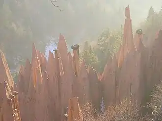 Postrzępione iglice wystają na wysokość do 40 metrów w kolorach ochrowym, czerwonym, fioletowym, na szczycie których osadzone są duże otoczaki. Całość usytuowana jest na wysokości powyżej 1000 m n.p.m.