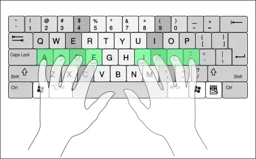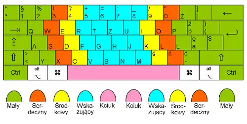 Co do obsługi poszczególnych klawiszy, jak widać na rysunku, każdy palec ma ściśle określony zakres przycisków.