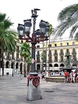 Latarnie na placu zostały zaprojektowane przez katalońskiego architekta Antoniego Gaudiego w 1879. Na zlecenie Rady Miasta Barcelony Gaudí przygotował dwa modele latarni z trzema i sześcioma ramionami, które początkowo miały być instalowane na różnych drogach publicznych w mieście. Ostatecznie na Plaça Reial zainstalowano tylko dwie latarnie z sześcioma ramionami. Dziesięć lat później na Plaça de Palau zainstalowano cztery trójramienne latarnie, z których dwie zachowały się do dziś. Są to dwie lampy gazowe wykonane z żeliwa z marmurową podstawą. Mają sześć żelaznych ramion z kawałkami brązu w stawach ramion, ułożonych w dwóch poziomach po trzy ramiona. Są udekorowane herbem Barcelony oraz wykończone dwoma zwiniętymi wężami i uskrzydlonym hełmem (kaduceusz Merkurego)[2].