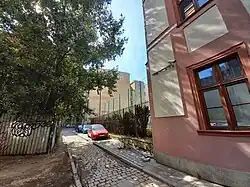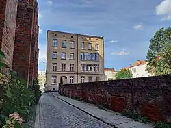 - od strony zachodniej – istniała zabudowa, obecnie rozebrana, za posesją przebiega ulica Zamkowa[15],