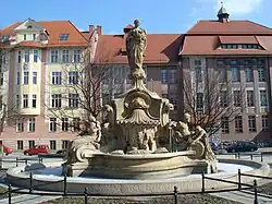 Rzeźby dolne przedstawiają dwóch rybaków z siecią, górnika z kilofem i kobietę ze snopami zboża i kobietę z koszem owoców, symbolizujących opolskie rybactwo, przemysł wapienniczy oraz rolnictwo. Ponad nimi, na kielichowatym postumencie góruje postać Ceres, bogini urodzaju, z dzieckiem na ręku oraz z wrzecionem. Do II wojny światowej wznosił się nad nią ażurowy miedziany baldachim. Fontanna otoczona została cembrowiną, z wyrytą sentencją „DES BÜRGERS TREU MIT FLEISS GEPAART EIN JUNGBORN GUTER DEUTSCHER ART” (Obywatelska wierność z pilnością w parze odmładzającym źródłem dobrej niemieckiej duszy), jednak w latach 70. napis ten został przykryty warstwą tynku. W wyniku konserwacji zabytku przeprowadzonej w 2009 roku odsłonięto ową inskrypcję.