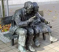 Postacie Jakuba i Elżbiety Scheibe’ów patrzą w kierunku kamienicy w północnej pierzei placu, gdzie kiedyś mieszkali. Jakub Scheibe i jego żona Elżbieta, mieszkali oni w Gdyni w latach dwudziestych XX w. i byli kochającym się małżeństwem Kaszubów.