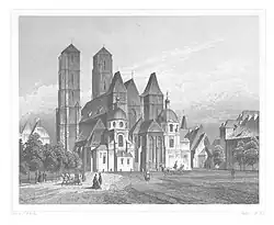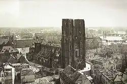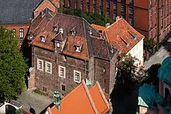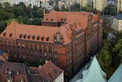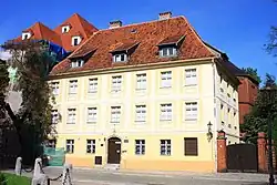 - ↑ Dawny konwikt chłopięcy obejmował zabudowę, która została ukształtowana w stylu "Zopf". Był to dom wychowawczy dla gimnazjalistów, którzy chcieli zostać księżmi. Po zniszczeniach wojennych ruiny zabudowy zostały rozebrane a w jego miejscu zbudowano przychodnię dla szkół wyższych[1][14].
