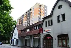 W konsumie pierwotnie mieściła się piekarnia, rzeźnik oraz inne sklepy[62]. Obecnie obiekt dalej pełni funkcje usługowo-handlowe, mieszczące w listopadzie 2020 roku m.in. piekarnię[63], serwis sprzętu AGD[64], przychodnię[65] czy salon fryzjerski[66]. | ![]() |