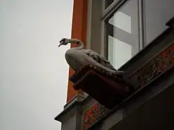 Kamienica przy placu Wolności 13 – wybudowana w latach 1890–1900 w stylu eklektycznym z elementami neorenesansu[19][20]. Została postawiona na budowli warownej należącej prawdopodobnie do zakonu templariuszy[20]. Jest to czterokondygnacyjna, narożna budowla znajdująca się w linii zabudowy ulicy. Po odnowieniu została pomalowana na kolor pomarańczowy. Fronton wieńczy fryz z wolich oczu i attyka. W narożu znajduje się jednokondygnacyjny, prostokątny wykusz wsparty na kroksztynach i zwieńczony balkonem z balustradą. Parter boniowany, a pozostałe kondygnacje tynkowane. Budynek posiada bogatą dekorację sztukatorską, w tym groteskę, wieńce laurowe oraz stylizowane łabędzie[19][20]. Kamienica mieści działającą od 1875 roku Aptekę pod Łabędziem[19]. Motyw łabędzia w nazwie apteki nie jest przypadkowy, bowiem niewielka rzeźba tego zwierzęcia zdobi narożny wykusz[8].