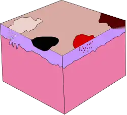 - barwnikowe, związane z odkładaniem się barwnika w skórze (np. piegi, plamy café au lait);