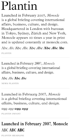 - ↑ Coles, Stephen (February 13, 2009). "In Use: Plantin for Monocle". The FontFeed. FSI FontShop International. Retrieved 2009-12-23.