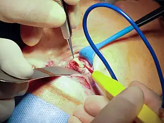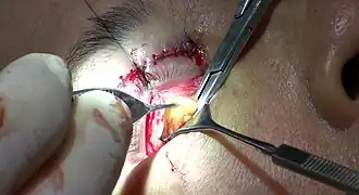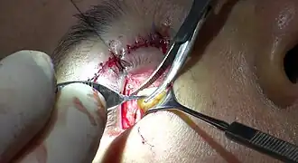 W przypadku powiek górnych cięcie wykonywane jest w naturalnej zmarszczce powieki, przy powiekach dolnych pod linią rzęs, dzięki czemu blizna po operacji jest praktycznie niewidoczna. W obu przypadkach cięcia wychodzą poza kąt oka, jednak nadal zlokalizowane są obrębie naturalnych zmarszczek. Poprzez wykonane nacięcia chirurg odseparowuje fragment skóry i usuwa nadmiar tkanki tłuszczowej, mięśni oraz redukuje nadmiar skóry. Następnie za pomocą bardzo cienkich szwów zaszywa cięcia, które po wygojeniu są bardzo słabo dostrzegalne.