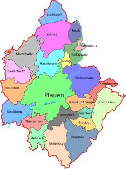 - Północ: Hammertorvorstadt, Haselbrunn, Preißelpöhl, Reißig, Reißiger Vorstadt, Reißigwald mit Lochhaus, Jößnitz, Steinsdorf, Kauschwitz, Zwoschwitz, Röttis
