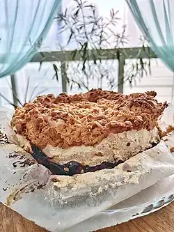 Porcję (jasnego) ciasta przeznaczoną na pierwszą warstwę ściera się na tarce[8] lub rozwałkowuje[3]. W przypadku zastosowania owoców puszczających sok podczas pieczenia, zaleca się podpiec spód przed przystąpieniem do wykładania na niego kolejnych warstw[3]. Pozostałe dwie porcje ciasta (ciemną i jasną) ściera się na tarce o dużych oczkach lub szarpie (skubie) prosto do formy[3][7].