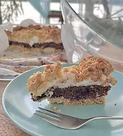 Warstwę owocową stanowi zazwyczaj kwaśna konfitura[1] lub dżem (np. z czarnej porzeczki, wiśni, moreli lub agrestu)[3]. Przed rozsmarowaniem dżemu na pierwszej warstwie ciasta, należy go rozetrzeć do plastyczności[8]. Dżem można zastąpić powidłami śliwkowymi, mrożonymi lub świeżymi owocami (np. duszone jabłka, rabarbar, wiśnie, czarna lub czerwona porzeczka, agrest, jagody, truskawki)[3]. Ta warstwa powinna tworzyć kwaskowaty kontrast względem pozostałych warstw.