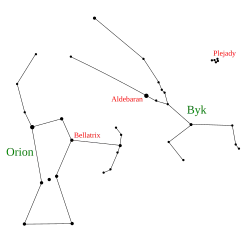 - Aby znaleźć Plejady zacznij od Bellatrix (Gamma Oriona, prawy górny róg Oriona). Wskaż tę gwiazdę kciukiem prawej ręki, a palcem wskazującym wskaż gwiazdę Aldebaran. Teraz trzymając tę odległość przesuń rękę na północny zachód, tak aby na Aldebaran wskazywał twój kciuk. Teraz palec wskazujący pokazuje Plejady.