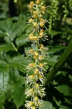 - Zielonkawe, niepozorne, zebrane w rozgałęzione, groniaste kwiatostany. Kwiaty mają 4 zielonkawe i wcześnie odpadające działki kielicha, 4 zielonkawobiałe płatki korony, 2-5 owłosionych słupków i liczne pręciki. W nasadzie dzbanuszkowatych płatków korony występują zagłębienia miodnikowe[6].