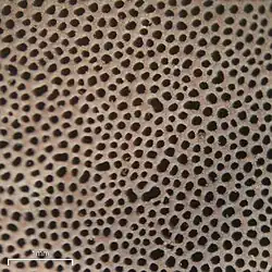 Rurkowy, o barwie początkowo białoróżowej, później brudnocielistej. Po uciśnięciu ciemnieje. Rurki mają długość 5–7 mm i tworzą wiele niewyraźnych warstw. Pory rurek są kanciaste i drobne; na 1 mm mieszczą się 3–4 (wyjątkowo do 5) porów. Każdy z nich ma średnicę 0,1–0,3 mm, a ściany porów są grube. W starszych warstwach pory te przerośnięte są białą grzybnią. Hymenofor ma słaby, grzybowy zapach i gorzki smak[5].