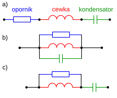 - ↑ W niektórych podręcznikach stosuje się inną konwencję, w której zarówno induktancja, jak i kapacytancja mają dodatnie znaki, zaś reaktancja ich połączenia szeregowego jest różnicą tych wartości.