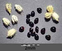 - Podługowaty, jednonasienny. Nasiona kuliste bądź kulistawe (0,5 mm długie i 0,4 mm szerokie).