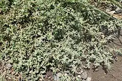 - Roślina o łodygach rozesłanych i silnie rozgałęzionych, osiągających do 30 cm długości, drewniejących u nasady. Korzeń palowy, tęgi, z drewniejącą szyjką korzeniową. Cała roślina gęsto, szorstko, krótko owłosiona, w kolorze szarozielonym[4].