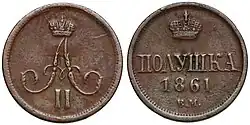 Na tej stronie znajduje się korona, pod nią napis „ПОЛУШКА”, poniżej rok 1855, 1860 lub 1861, a pod nim znak mennicy w Warszawie – litery w cyrylicy В.М. (Варшавская Монета)[2].