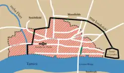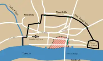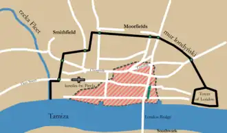 Położenie na mapie![]() Środkowy London w 1666 roku. Spalony obszar zaznaczony na różowo, Pudding Lane na niebiesko. | |