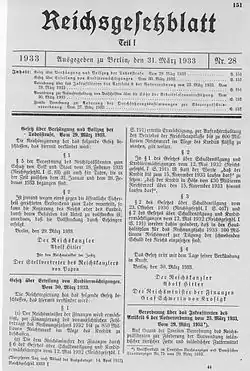 - ↑ Wojciech Wichert. Ustawa o pełnomocnictwach (Ermächtigungsgesetz) z 23 marca 1933 roku jako katalizator budowy państwa wodzowskiego w Niemczech. „Studia nad Autorytaryzmem i Totalitaryzmem”. tom 41 (nr 4), s. 31, 2019.