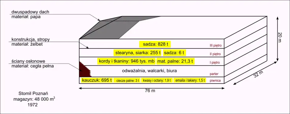 Zakłady Stomil w 1972 składały się z 4 obiektów (walcownia, magazyn kauczuku, hala produkcyjna, budynek biurowy) oraz stawu (zbiornik przeciwpożarowy). Magazyn kauczuku znajdował się bezpośrednio przy hali produkcyjnej. Magazyn, o konstrukcji szkieletowej żelbetowej, miał 5 kondygnacji (4 nadziemne i 1 podziemna). Wyposażony był w windę (drugi szyb windy był w budowie) i klatki schodowe. Wjazd do budynku – z poziomu piwnicy (brama). W magazynie składowano łatwopalne materiały produkcyjne: