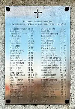 ![]() Krzyż-pomnik upamiętniający ofiary pożaru, postawiony w miejscu gdzie znajdowało się kino. | |