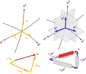 - bazy kontrawariantne – zbiory wektorów prostopadłych do powierzchni współrzędnych, (z górnymi indeksami).