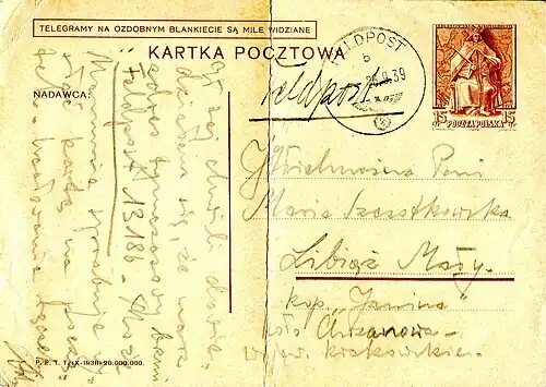 - Głównej Poczty Frontowej Nr III w Lublinie do Intendentury Dowództwa Okręgu Generalnego „Lublin”[4].