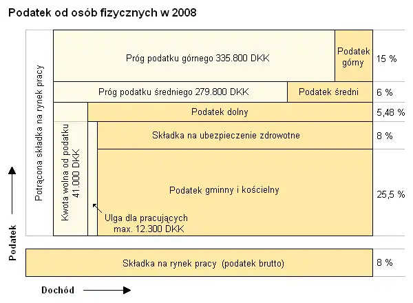 | Składka na rynek pracy (AM-bidrag) | 8 | Dochód ze stosunku pracy (lønindkomst) | nie ma |