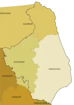 - Mazowsze – ziemia łomżyńska i ziemia wiska (większość powiatu grajewskiego, powiat kolneński, powiat łomżyński, powiat zambrowski, zachodnia część powiatu wysokomazowieckiego, zachodnia część powiatu białostockiego)
