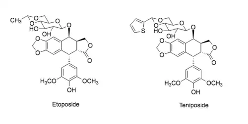 Dwie półsyntetyczne glikozydowe pochodne podofilotoksyny, etopozyd (VP-16) i tenipozyd (VM-26), są aktywnymi środkami przeciwnowotworowymi, które zostały zatwierdzone przez FDA do chemioterapii w leczeniu drobnokomórkowego raka płuca, ostrej białaczki limfoblastycznej i raka jądra[4]. Wykazują one jednak różne skutki uboczne, takie jak supresja szpiku kostnego, utrata włosów i neurotoksyczność[4]. W celu ich uniknięcia oraz zwiększenia rozpuszczalności zaproponowano różne strategie modyfikacji struktury chemicznej podofilotoksyny i sposobów jej podawania[5]. Na przykład micelle złożone z podofilotoksyny i kwasu poliakrylowego wykazały poprawioną skuteczność przeciwnowotworową w przypadku wielolekoopornego raka piersi[3]. Inną ścieżką jest rozwój syntetycznych pochodnych, takich jak GL-331 (4'-demetylo-4β-(4"-nitroanilino)-4-dezoksypodofilotoksyna; 2,5–17 razy aktywniejsza od VP-16)[6], TOP 53 (4β-aminoalkilo-4'-O-demetylo-4-dezoksypodofilotoksyna; 3–5 razy aktywniejsza od VP-16)[7] i NK 611 (w pierścieniu glukozy w pozycji 2 zawiera grupę dimetyloaminową zamiast hydroksylowej; jest 120 razy lepiej rozpuszczalny w wodzie niż VP-16, dzięki czemu wykazuje większą aktywność przeciwrakową)[8].