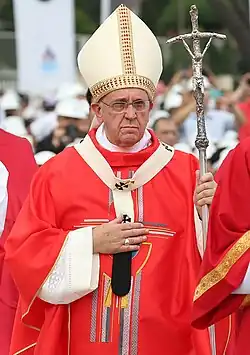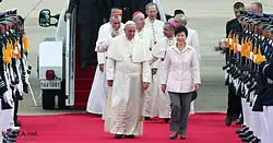 Papież Franciszek po przylocie na lotnisko w Seulu (obok niego prezydent Korei Park Geun-hye)Papież Franciszek podczas mszy św. beatyfikacyjnej Pawła Yun Ji-chunga i 123 Towarzyszy przy bramie Gwanghwamun