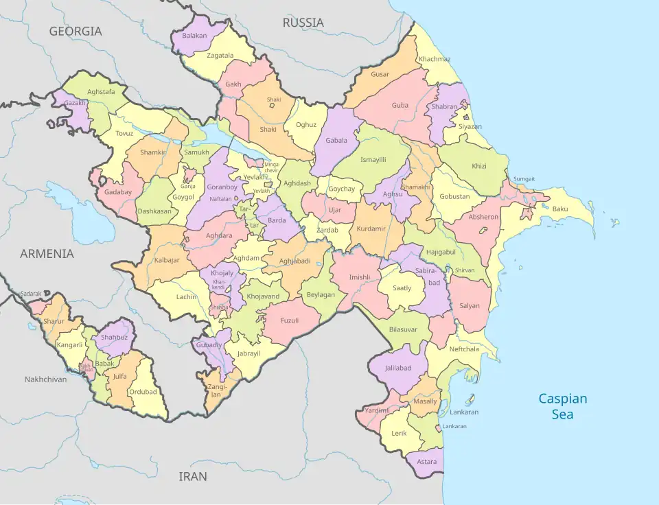 - 67 rejonów (az. rayon, l.mn. rayonlar).
