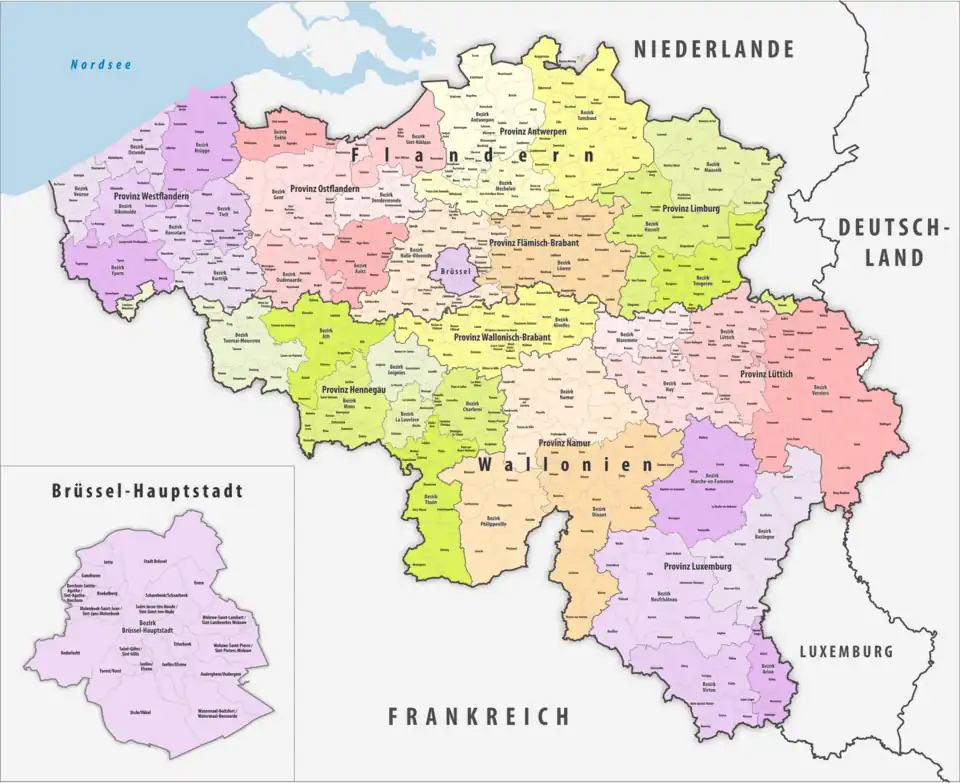 Mapa regionów, prowincji, okręgów i gmin w Belgii od 1 stycznia 2019