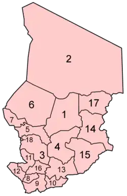 W latach 2002–2008 Czad podzielony był administracyjnie na 18 regionów, wliczając w to także region stołeczny Ndżamena posiadający specjalny status administracyjny.